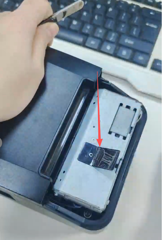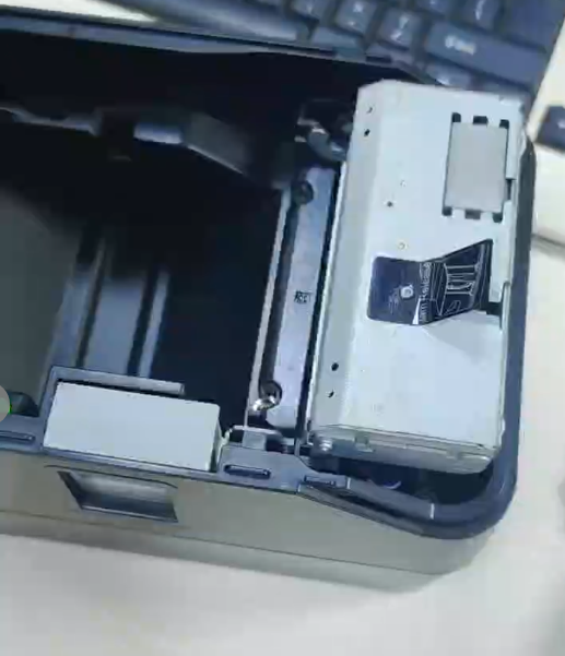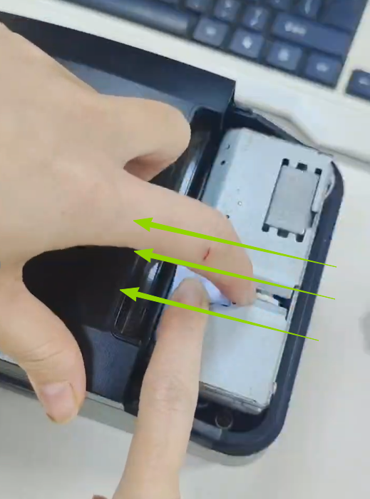 After opening the front cover, look inside the printer’s paper compartment. You will find a prominent black gear (marked with a black label for easy identification, as shown in the figure). This gear is directly linked to the cutter mechanism—adjusting it will help reset the stuck cutter.
